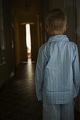 Young boy looking through window