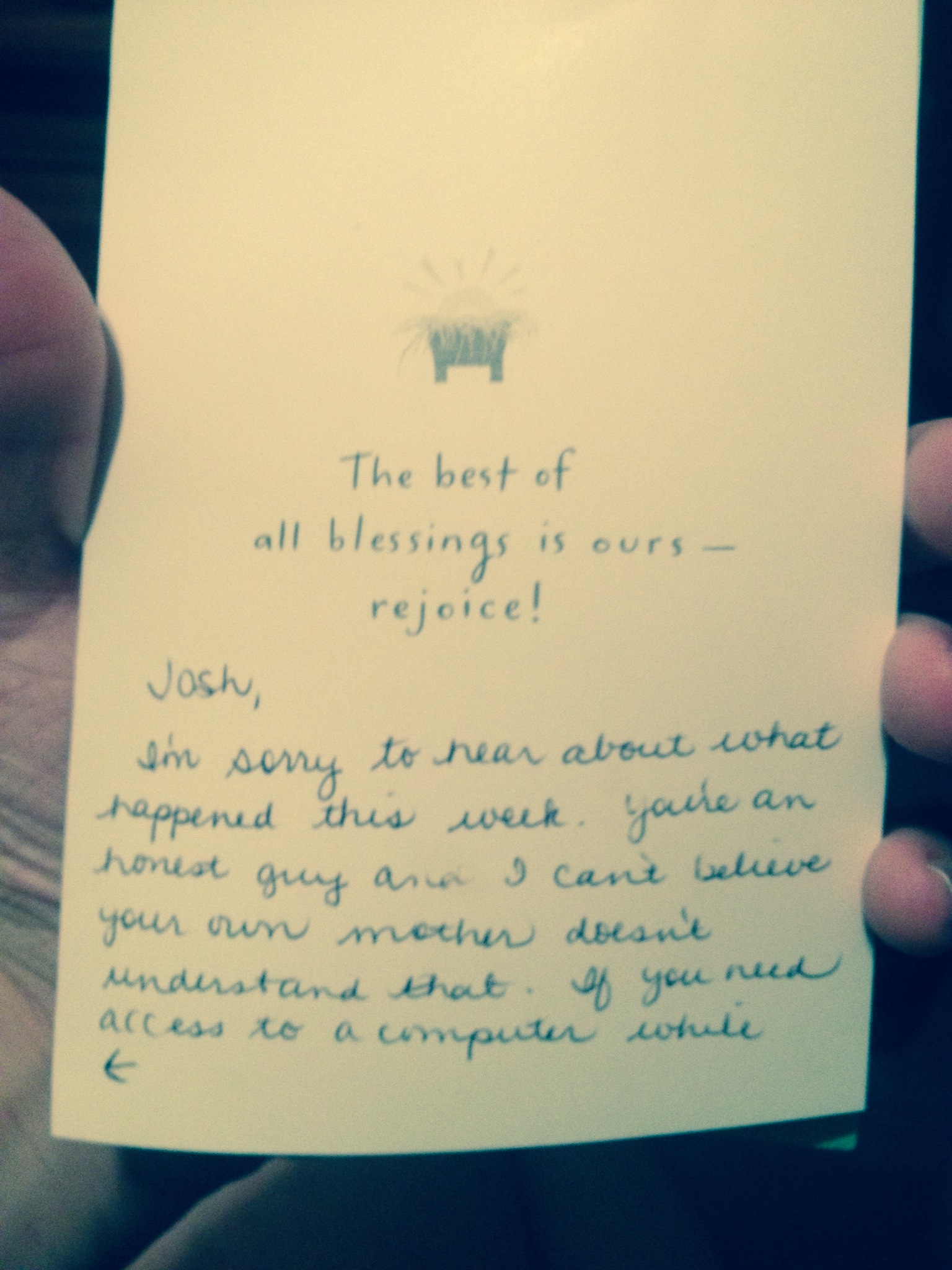 “Wow, your step-dad is a piece of work, but he will be dropping your computer off in the morning, but on the off chance he doesn’t call me,” He says handing me his card, “And I will personally go down and get your computer back.”